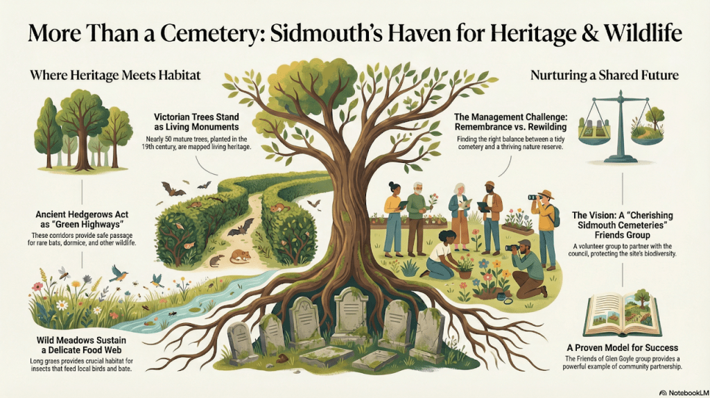 What comes to mind when you think of a cemetery? For most, it’s a place of quiet remembrance, of stone monuments and peaceful reflection. But what if a cemetery could be something more? Here in Sidmouth, our town cemetery has become just that—an unexpected and vibrant nature reserve, where local history and ecology are deeply intertwined.